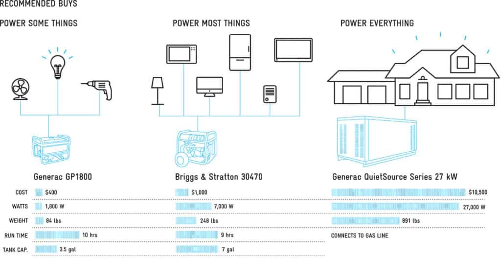 If like most homes your house is already supplied with gas, or if LPG is readily available in your area, a bi-fuel NG/propane Genset is your logical choice. See our detailed standby Genset review for ratings and characteristics of the best systems.