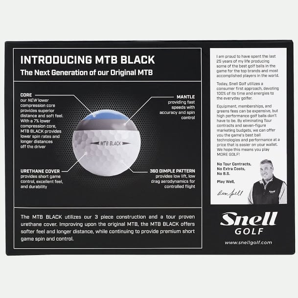 The Snell MTB Black golf ball is a 3-piece urethane covered golf ball that is designed to provide high ball speeds, low driver spin, moderate iron spin, and a soft feel. It is a popular choice for golfers who are looking for a tour-caliber ball at a great value.